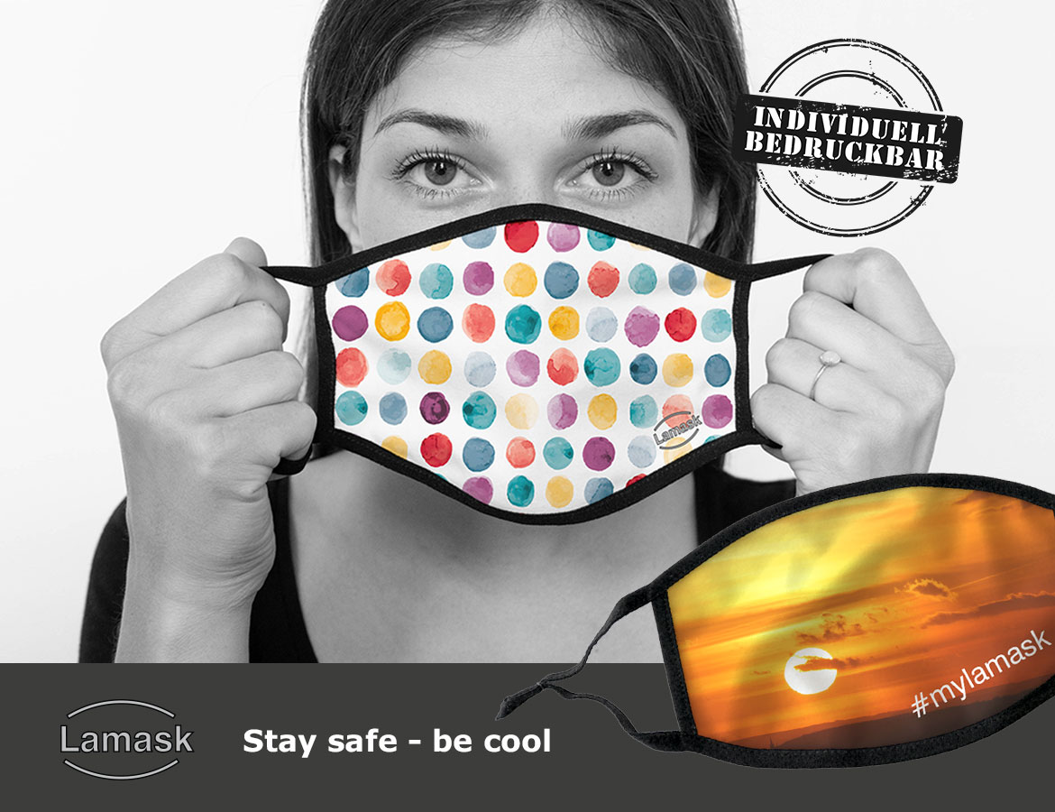 Lamask bietet mit der Kollektion 2020 viele Designmotive. Und wenn es etwas ganz Individuelles sein soll, kannst Du die Behelfsmaske auch mit einem eigenen Foto oder Text personalisieren oder sie ist mit Deinem Logo und Slogan bedruckbar, z.B. als cooles Werbegeschenk für Deine Firmenpromotion.